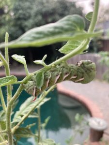 and upon closer inspection, realized it had the proverbial “half a worm” within its grasp, and, after puncturing it, was slowly lapping up the remaining half.I understand there’s a type of wasp that lays its eggs in the hornworm, but I’ve never seen any evidence of that here.