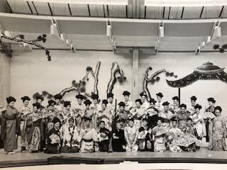 I am standing on the right, front row, second person in. We are wearing black wigs, but the kimono was my own, brought by my aunt from a trip to Japan.