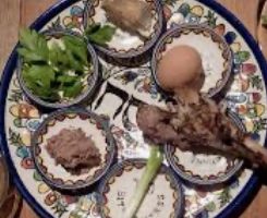 Hours before my Seder, David sent me a photo of what he and Anna did (they are 5 hours ahead). She is a vegetarian, so made some appropriate substitutions on their Seder plate.
