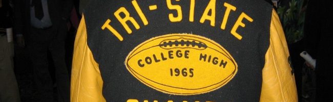 I have been to exactly seven football games in my life, not counting my high school games. And I think a real aficionado would not count my high school games because we played six-man football. Our school was much too small to field a larger team, with only 15 boys in every grade, at least half of whom were not interested in sports. So we played in a Tri-State League of small, mostly private schools in New Jersey, New York, and Connecticut. In 1965, my sophomore year, we actually won the league championship. This was very exciting, especially since all those private schools, while small, were still much bigger than my school, and had money to spend on athletic scholarships, so they had serious athletes, unlike us. Anyway, our team got these great championship jackets, and when I went to an all-school reunion forty years later, there were two or three guys who still had their jackets and were wearing them, one of whom is in the Featured Image.