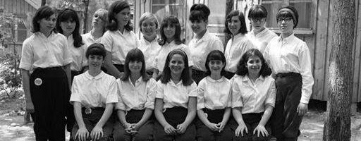By 1966, my third summer, I was in Intermediate Girls Cabin 12, now an “Upper” Intermediate. I was already close friends with Christie, who had been in my cabin the previous summer, but she was now in Cabin 13. Ida, who had been in Junior Girls 10 with me in 1964 and was also in IG 13, so I was an honorary member of that cabin and hung out there a lot. Emily, too, became a very close friend. She cut up her yearbook from Larchmont, NY so that I could build a shrine to a boy, now in the High School division, on whom I had a mad crush (he didn’t know I existed). Christie, Emily and I were in several classes together and remain very close friends to this day. Em sang at my wedding.