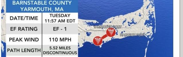 A day later the National Weather Service confirmed that a third tornado had touched down briefly on Tuesday in West Yarmouth, painfully close to my two friends’ homes. As one put it, they truly dodged a bullet. This is extremely rare, according to the National Weather Service. Since the beginning of recorded weather history, tornadoes have hit Cape Cod just three other times; one in Woods Hole in October 2018, one at Hyannis/Barnstable Airport in August 1977 and one near Sandwich in August 1968. The weather is becoming more ferocious. “Once in a hundred year storms” are coming regularly.