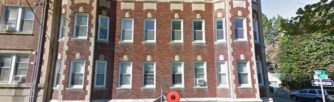 It was the basement apartment, and we entered through the outside stairs you can see in the picture (right where the red pointer is – thanks Google Maps!), so we never went into the lobby of the apartment building. I didn’t really have the sense of being in a large building, and was surprised to see how big it actually was when I pulled it up on Google Maps to get the picture. I’m not sure if we ever took a broom and knocked three times on the ceiling to get our upstairs neighbors to quiet down, but we might have, so that’s the reference in the title song.